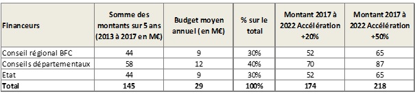 Le SCoRAN de Franche Comté ne précise pas le budget annuel net investit par la Région. En appliquant une clé de répartition identique à celle de la Bourgogne, sur la base d’un montant d’investissements global de 40 M€ sur la phase 1 (2013 à 2017), nous obtenons les budgets suivants entre partenaires :