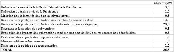 Le total des mesures relatives au train de vie des régions (taille du cabinet, train de vie de la présidence, indemnités) proposées par le candidat représente environ 7,3 M€, soit 2,3 % des frais de structure des deux régions (13,8 % hors dépenses de personnel). Cet objectif apparaît ainsi réalisable sur 5 années. Les mesures relatives à la communication impliqueraient une réduction de budget d’environ 25 %.