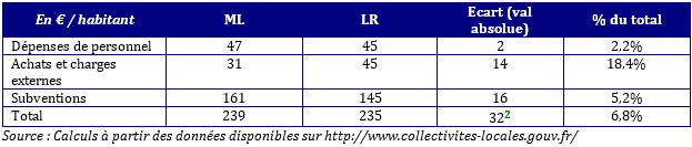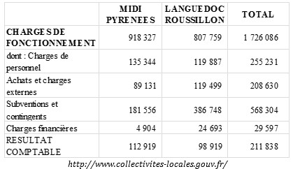 Pour disposer d’un ordre de grandeur, il est possible de comparer les dépenses de fonctionnement par habitant en Midi-Pyrénées et en Languedoc-Roussillon et d’estimer quelles économies de gestion pourraient être dégagées en alignant chaque type de dépenses sur le niveau de la région la plus « efficiente ».