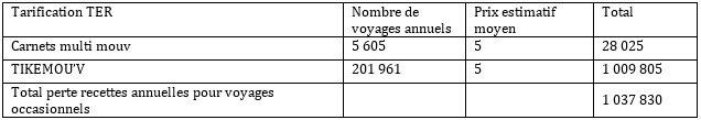 Le chiffrage se fonde donc sur le nombre de voyages effectués occasionnellement auquel est appliqué un coût moyen . Le tableau ci-dessous résume la perte estimative de recettes engendrée par la proposition.