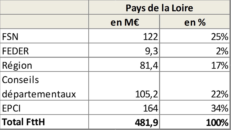 La stratégie de cohérence régionale pour l’aménagement numérique (SCoRAN) des Pays-de-la-Loire, rédigée en 2011 et révisée en 2014 estime à 482 M€ le montant des investissements publics nécessaires pour offrir un raccordement fibre optique jusqu’à l’abonné pour 65 % des ligériens à horizon 2020 et « un haut débit de qualité » à l’ensemble des ligériens hors zone conventionnée et zone FttH d’intervention publique à horizon 2017 (zone rurale).